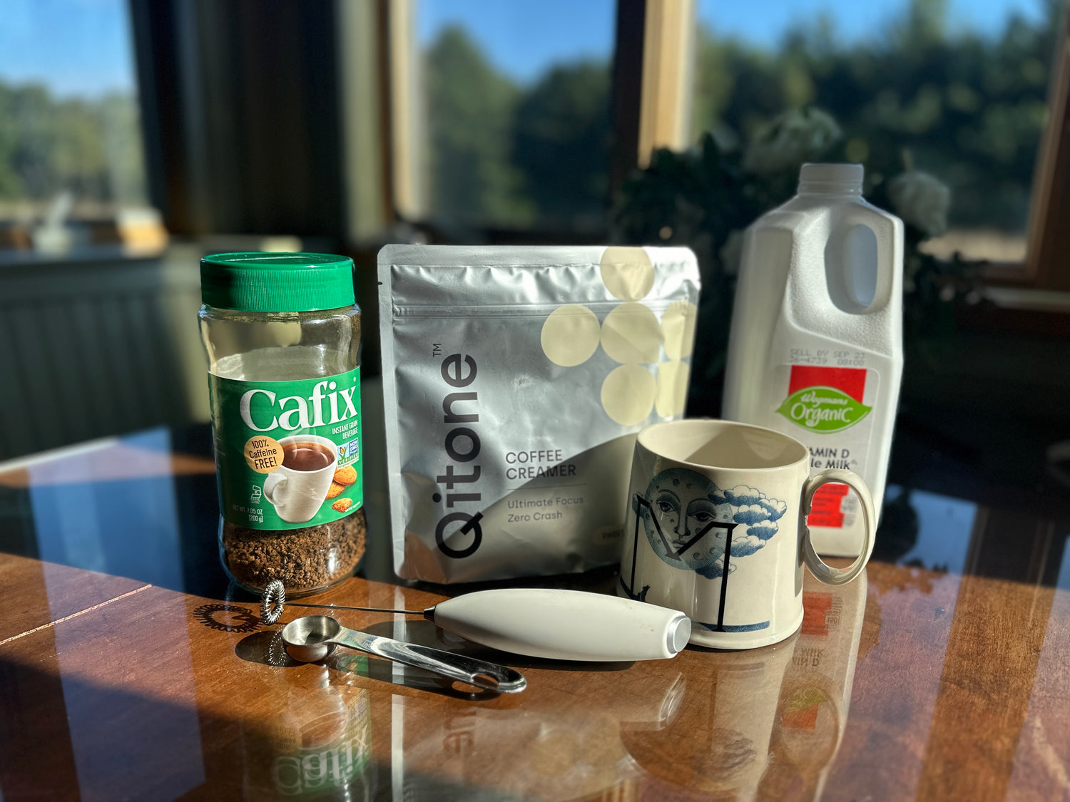 A throwback to the 80's, this recipe uses Cafix which is a natural, caffeine-free coffee alternative made from a blend of roasted barley, rye, chicory, and sugar beets. Paired with Qitone Sweet Cream coffee creamer, it mixes deliciously and has very few calories so it can be enjoyed multiple times a day without having to worry about a caffeine or calorie overload!