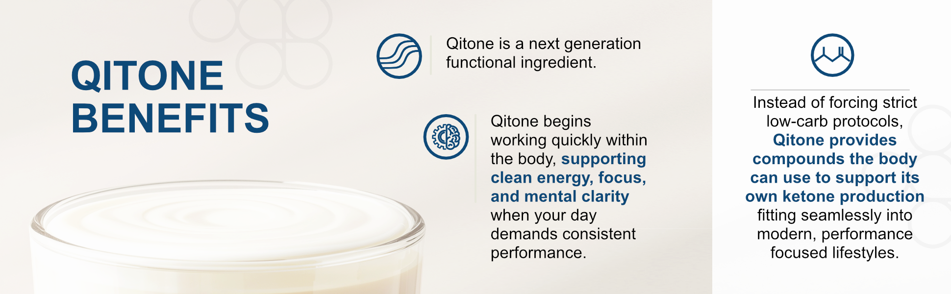 Qitone is quickly broken down in the digestive system into two organic compounds: the C8 medium chain fatty acid (MCT) unique to Qitone, and (R)-1,3 butanediol. The C8 MCT is converted into β-hydroxybutyrate (BHB) ketones through the same pathway the body normally uses to make ketones primarily during periods of low glucose availability. The butanediol compound is also converted by the liver into BHB ketones using an alternative pathway. These elevated ketones then serve as a highly efficient fuel source for your brain and body, delivering the various benefits of a ketogenic state without the strict dietary adherence.